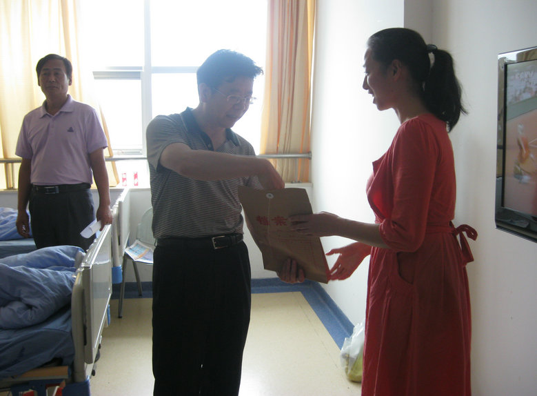 公司工會(huì)主席李應(yīng)濤到醫(yī)院看望病人并將愛心捐款如數(shù)交給患者家屬