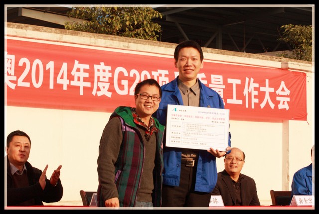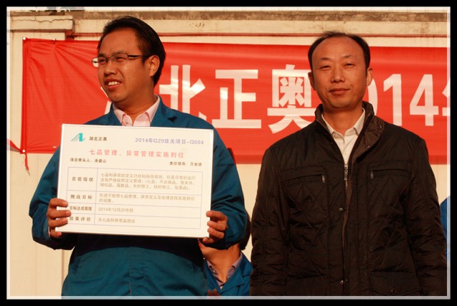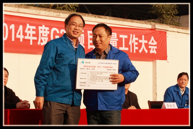 到會領(lǐng)導(dǎo)為G29項目組成員頒發(fā)了戰(zhàn)表,為下一階段的改善制定新的挑戰(zhàn)目標(biāo),全體員工見證了這一重要時刻,并在會議現(xiàn)場用熱烈的掌聲表達了完成任務(wù)的信心和決心。