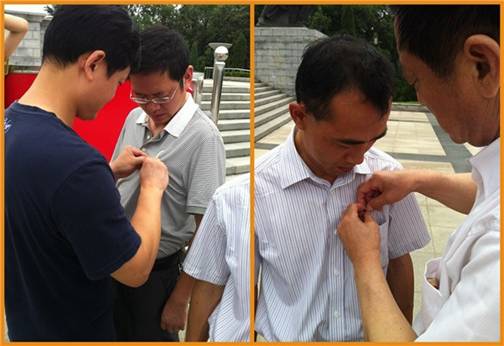 進(jìn)入陵園后,在公司黨支部書記萬(wàn)全進(jìn)的帶領(lǐng)下,恒通公司全體黨員在革命烈士紀(jì)念碑前重溫入黨誓詞,隨后舉行了對(duì)預(yù)備黨員鄧輝轉(zhuǎn)正,同時(shí)吸收余招輝、黃東明為預(yù)備黨員的宣誓儀式,由萬(wàn)全進(jìn)書記和劉清元副總經(jīng)理分別為兩位預(yù)備黨員佩戴黨徽。